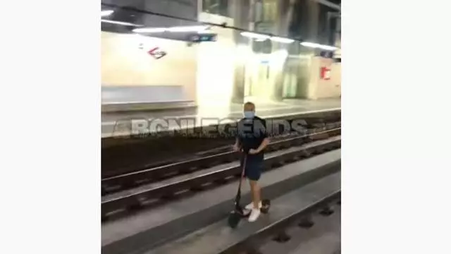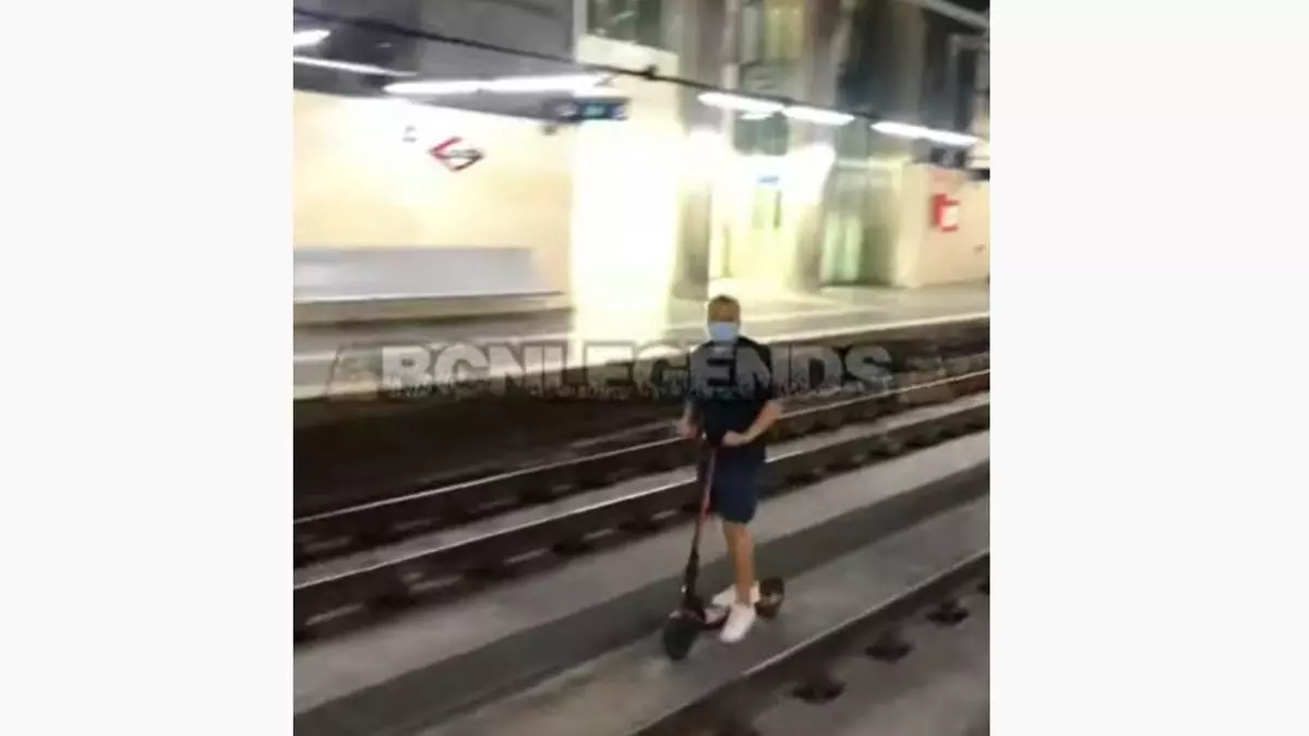 Graven un noi anant en patinet elèctric per les vies de l'estació de Sant Josep d'FGC