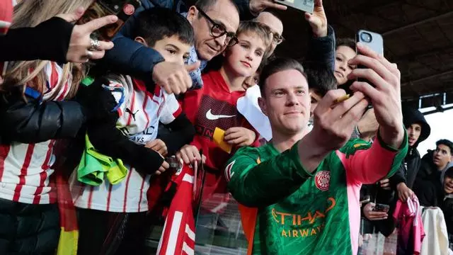 Ter Stegen es fa un selfie amb aficionats del Girona, a Montilivi. / GORKA URRESOLA ELVIRA
